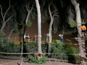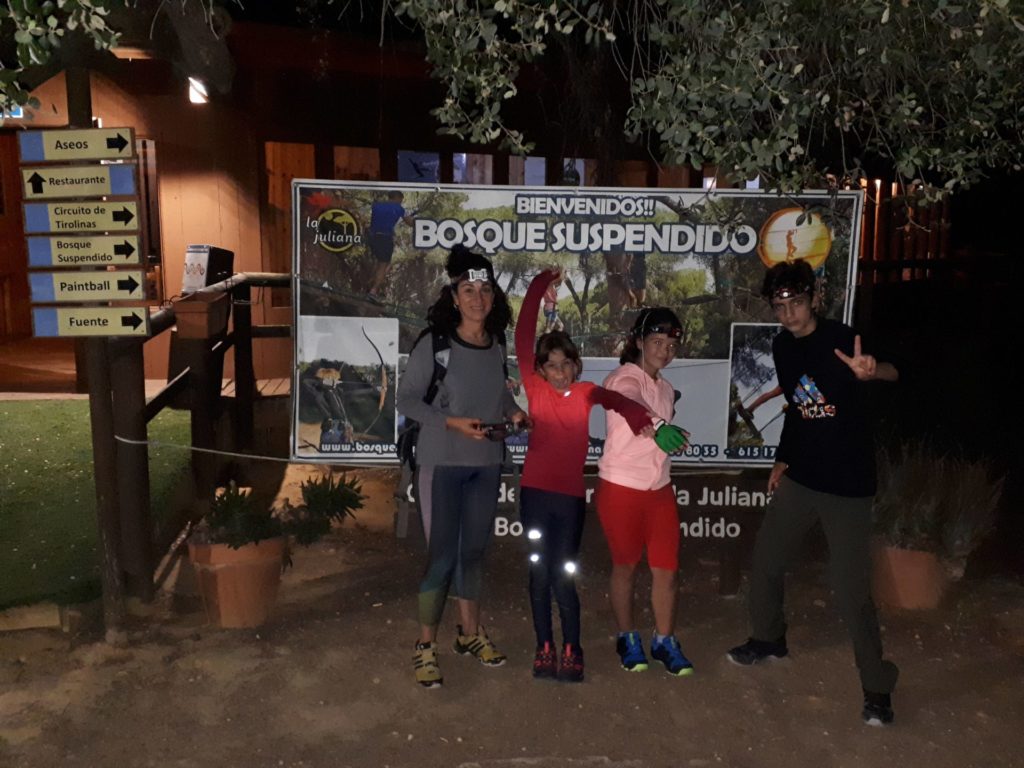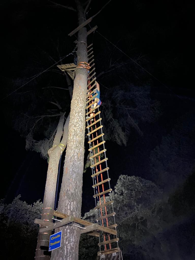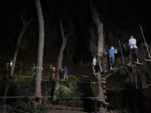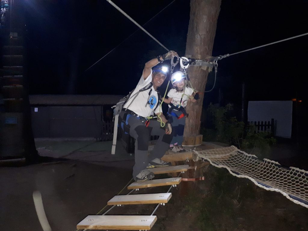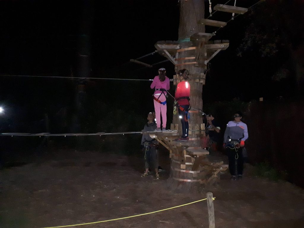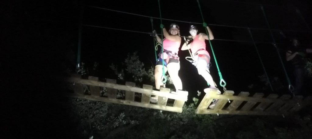 Consiste en llevar a cabo los circuitos de aventura en los arboles y nuestro circuito de tirolinas en condiciones de total oscuridad, con la única iluminación del frontal de cada participante y en ocasiones solo con la luz de la luna.