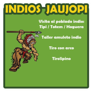 Conocerán nuestro poblado indio y a los componentes de la tribu Jau Jopi, sus costumbres, sus rituales, practicarán el tiro con arco, necesario para salir a cazar, volarán en las tirolinas y elaborarán su propio amuleto indio, además de llevar a cabo la ceremonia del tótem donde serán bautizados con sus nombres indios.